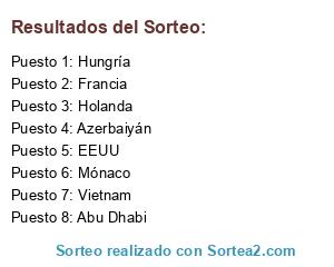 Lista de participantes: Australia, Bahrein, China, Vietnam, España, Holanda, Mónaco, Azerbaiyán, Canadá, Francia, Austria, Gran Bretaña, Hungría, Bélgica, Italia, Singapur, Rusia, Japon, EEUU, México, Brasil, Abu Dhabi.