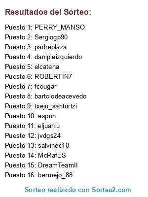 Lista de participantes: McRafES, padreplaza, ROBERTIN7, salvinec10, bartolodeacevedo, txeju_santurtzi, bermejo_88, eljuanlu, PERRY_MANSO, Sergiogp90, DreamTeamII, danipieizquierdo, elcatena, fcougar, jvdgs24, espun.