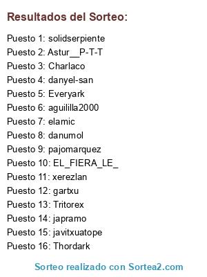 Lista de participantes: EL_FIERA_LE_, Astur__P-T-T, javitxuatope, xerezlan, elamic, danumol, Tritorex, Everyark, danyel-san, Charlaco, pajomarquez, aguililla2000, Thordark, japramo, gartxu, solidserpiente.