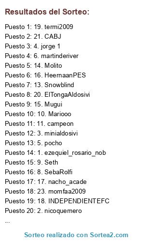 Lista de participantes: 1. ezequiel_rosario_nob , 10. Mariooo , 11. campeon , 12. Eliamm , 13. Snowblind , 14. Molito , 15. Mugui , 16. HeernaanPES , 17. nacho_acade , 18. INDEPENDIENTEFC , 19. termi2009 , 2. nicoquemero , 20. ElTongaAldosivi , 21. CABJ , 22. krlitos09 , 23. momfaa2009 , 24. Mathee, 3. minialdosivi , 4. jorge 1 , 5. pocho, 6. martinderiver , 7. Magic_Rosicky, 8. SebaRolfi , 9. Seth , .