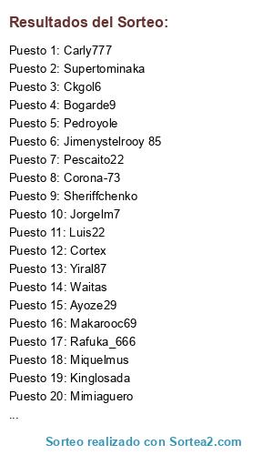 Lista de participantes: Rafuka_666, Coyu, Meawx, Supertominaka, Sheriffchenko, Carly777, Jorgelm7, Cortex, Makarooc69, Imparable_1898, Amortee, Bogarde9, Cartama, Luis22, Roqueluis, Juanmiole, Twisterswar, Waitas, Yiral87, Romapro, Miquelmus, Pescaito22, Ayoze29, Mimiaguero, RG1425, Selinichev, Kinglosada, Pedroyole, Ckgol6, Jimenystelrooy 85, Mcmurphy, Corona-73.