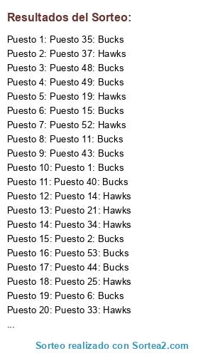 Lista de participantes: Puesto 1: Bucks, Puesto 2: Bucks, Puesto 3: Hawks, Puesto 4: Hawks, Puesto 5: Hawks, Puesto 6: Bucks, Puesto 7: Hawks, Puesto 8: Hawks, Puesto 9: Bucks, Puesto 10: Hawks, Puesto 11: Bucks, Puesto 12: Hawks, Puesto 13: Bucks, Puesto 14: Hawks, Puesto 15: Bucks, Puesto 16: Hawks, Puesto 17: Bucks, Puesto 18: Bucks, Puesto 19: Hawks, Puesto 20: Hawks, Puesto 21: Hawks, Puesto 22: Hawks, Puesto 23: Bucks, Puesto 24: Hawks, Puesto 25: Hawks, Puesto 26: Bucks, Puesto 27: Hawks, Puesto 28: Bucks, Puesto 29: Bucks, Puesto 30: Hawks, Puesto 31: Hawks, Puesto 32: Hawks, Puesto 33: Hawks, Puesto 34: Hawks, Puesto 35: Bucks, Puesto 36: Bucks, Puesto 37: Hawks, Puesto 38: Hawks, Puesto 39: Hawks, Puesto 40: Bucks, Puesto 41: Hawks, Puesto 42: Hawks, Puesto 43: Bucks, Puesto 44: Bucks, Puesto 45: Bucks, Puesto 46: Hawks, Puesto 47: Hawks, Puesto 48: Bucks, Puesto 49: Bucks, Puesto 50: Bucks, Puesto 51: Hawks, Puesto 52: Hawks, Puesto 53: Bucks, Puesto 54: Bucks, Puesto 55: Bucks, Puesto 56: Hawks.