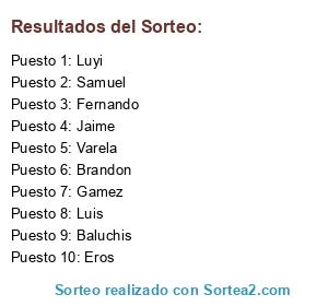 Lista de participantes: Fernando, Brandon, Jaime, Gamez, Luyi, Baluchis, Varela, Luis, Samuel, Eros.
