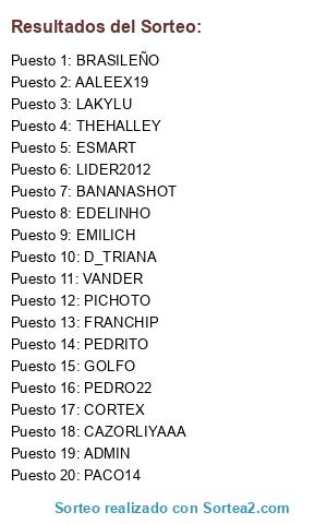 Lista de participantes: ADMIN, BRASILEÑO, CORTEX, D_TRIANA, EMILICH, PACO14, AALEEX19, PICHOTO, LIDER2012, FRANCHIP, PEDRITO, PEDRO22, LAKYLU, BANANASHOT, CAZORLIYAAA, THEHALLEY, EDELINHO, VANDER, ESMART, GOLFO.