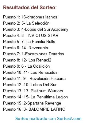 Lista de participantes: 1-Escorpiones Dorados, 2-Spartans Revenge, 3- BALOMPIÉ LATINO, 4-Lobos del Sur Academy, 5- La Selección, 6 - La Coalición, 7- La Familia Bulls, 8 - INVICTUS STAR, 9 - Revolución Hispana, 10- Lobos Del Sur, 11- Los Renacidos, 12- Los Renaci2, 13- Platinum Warriors, 14- Revenants, 15- La Penúltima Legion, 16-dragones latinos.
