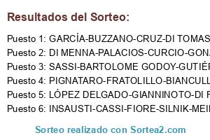 Lista de participantes: PIGNATARO-FRATOLILLO-BIANCULLI-HELAS-DROHOBYCKI, GARCÍA-BUZZANO-CRUZ-DI TOMASO-ROTRYING, LÓPEZ DELGADO-GIANNINOTO-DI FRANCESCO-KAWULOK-GAYNOR, INSAUSTI-CASSI-FIORE-SILNIK-MEIRIÑO, DI MENNA-PALACIOS-CURCIO-GONZÁLEZ DE MARCHI-HURTADO, SASSI-BARTOLOME GODOY-GUTIÉRREZ RUSH-ACUÑA-GUARINO.