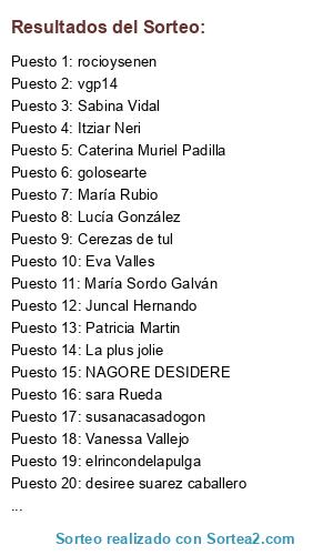 Lista de participantes: Ana Belen Haro, Los Jabones de Álex, Olga González Villanueva, Eva Valles, sandra Rueda, Marta Franco Lopez, sara Rueda, NAGORE DESIDERE, yoai, Vidacupe, Isabel C. F., taniaag_81, susanacasadogon, desiree suarez caballero, Verónica González, María Sordo Galván, Caterina Muriel Padilla, Raquel Izquierdo Moreno, María Rubio, Eva Ramos, Pili Morales, vgp14, Lucía González, Sofy León, Juncal Hernando, Marta Mil Delicias, Teresa Fernández, Vanessa Vallejo, Marta Sarandeses Garcia, Sara torres montero, Alicia González Fernández, Carmen Sanchez Bandera, Maria Jesus Rodríguez, La plus jolie, Patricia Martin, Rocío Córdoba, elrincondelapulga, MARTA ROBLA, carmengoalcuadrado, Montse Cce, Maite González, Begoña Borao, Cerezas de tul, Ladykassandra Vr, dequitaypon-Miriam, Elisabet fernandez fernandez, golosearte, Itziar Neri, una galleta para mi, Ana Hernández, Sabina Vidal, losmundosdemariroci, evarubiom, DulceGv, Emilú Díaz, aulalopedevega, Arantxa Ponte Fieltro, eva salado martin, pazcrespo, mama_teru, abgv_79, rocioysenen, Eva Maria Gonzalez GArcia, qkukas, Déborah Tg, kirch, anamolinos.