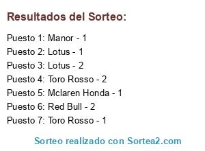 Lista de participantes: Force India - 1, Force India - 2, Manor - 1, Manor - 2, Red Bull - 1, Red Bull - 2, Toro Rosso - 1, Toro Rosso - 2, Mclaren Honda - 1, Mclaren Honda - 2, Lotus - 1, Lotus - 2.