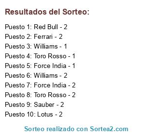 Lista de participantes: Williams - 1, Williams - 2, Sauber - 1, Sauber - 2, Toro Rosso - 1, Toro Rosso - 2, Ferrari - 1, Ferrari - 2, Lotus - 1, Lotus - 2, Force India - 1, Force India - 2, Red Bull -1, Red Bull - 2.