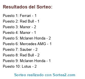 Lista de participantes: Mercedes AMG - 1, Mercedes AMG - 2, Ferrari - 1, Ferrari - 2, Red Bull - 1, Red Bull - 2, Lotus - 1, Lotus - 2, Mclaren Honda - 1, Mclaren Honda - 2, Manor - 1, Manor - 2, Sauber - 1, Sauber - 2.