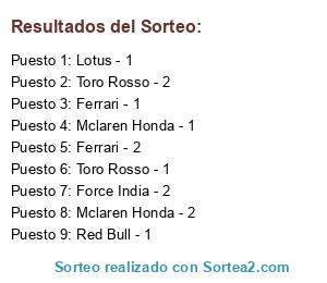Lista de participantes: Ferrari - 1, Ferrari - 2, Red Bull - 1, Red Bull - 2, Williams - 1, Williams - 2, Lotus - 1, Lotus - 2, Toro Rosso - 1, Toro Rosso - 2, Force India - 1, Force India - 2, Mclaren Honda - 1, Mclaren Honda - 2.