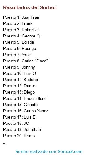 Lista de participantes: Xavy, Johnny, Edison, Rodrigo, Santiago, Frank, Javi, Carlos "Flaco", Leo, Luis O., Yonel, Danilo, Robert, Robert Jr., Jorge C., Anthony, Luis E., George Q., Markeins, Diego, Gordito, Paul, Jonathan, Carlos Yanez, Ender Blondll, Primo, JC, JuanFran, Christian S., Ricardo, Stefano, Juan Jose Lopez.