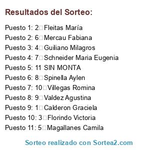 Lista de participantes: 1 Calderon Graciela, 2 Fleitas María, 3 Florindo Victoria, 4 Guiliano Milagros, 5 Magallanes Camila, 6 Mercau Fabiana, 7 Schneider Maria Eugenia, 8 Spinella Aylen, 9 Valdez Agustina, 10 Villegas Romina, 11 SIN MONTA.