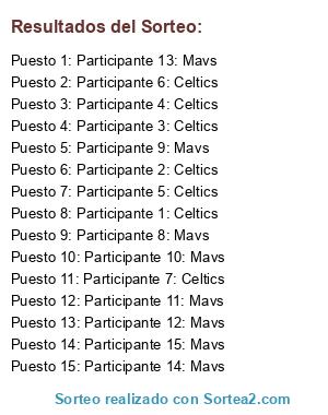 Lista de participantes: Participante 1: Celtics, Participante 2: Celtics, Participante 3: Celtics, Participante 4: Celtics, Participante 5: Celtics, Participante 6: Celtics, Participante 7: Celtics, Participante 8: Mavs, Participante 9: Mavs, Participante 10: Mavs, Participante 11: Mavs, Participante 12: Mavs, Participante 13: Mavs, Participante 14: Mavs, Participante 15: Mavs.
