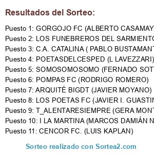Lista de participantes: ANTÍLOPES07 (GUILLERMO BESSONE), ARQUITÉ BIGDT (JAVIER MOYANO), BOCA FC 11 (GABRIEL DONDIO), C.A. CATALINA ( PABLO BUSTAMANTE), C.A. CHOCON LAUQUEN (C MACAGNO), CAVISACATE (DIÓGENES MOYANO), CENCOR FC. (LUIS KAPLAN), CLUB TOTORAL (TOMÁS J. MOYANO), DINAMO FA (MARCELO MELLANO), EL EQUIPO PAPÁ (LUIS A. CASAMAYOR ), ESCUELA RAÚL (RAÚL CASAMAYOR), FARSA F.C. (MIGUEL RAFAEL), FREY CLUB FC (JOSÉ FREYTE), GLORIOSO COR AR (JUAN S PEDERNERA), GORGOJO FC (ALBERTO CASAMAYOR), I LA MARTINA (MARCOS DAMIÁN NORIEGA), LA CROTA F.C. (JOSÉ LUIS FORNACIARI), LAS ESPERANZAS DE LULA (LUCAS ORTÍZ), LOS FUNEBREROS DEL SARMIENTO (chapa), LOS POETAS FC (JAVIER I. GUASTINI), MANCHESTER SUIITY (PABLO SABEH), MAXI AC. (MAXIMILIANO CORRADI), NO N@ME (CLAUDIA E. PEREYRA), NUNCAUNGOL F.C. (MATÍAS GIUSTI), ONCE CALDOS F.C. (FEDERICO N. GARCÍA), PHILADELPHIA BOXS (FABIÁN TORRES), POETASDELCESPED (L LAVEZZARI) , RESURGIR F.C.(BRUNO E. CABALLIERI), SOMOSOMOSOMO (FERNADO SOTTANO), T_ALENTARESIEMPRE (GERA MONTICH), TORNADO 5 (GUADALUPE MONTANI), TORNADO UNO (HERNÁN MONTNI), POMPAS FC (RODRIGO ROMERO).