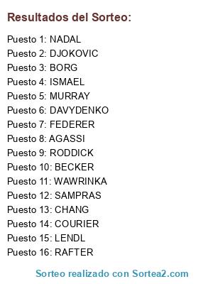 Lista de participantes: CHANG, DJOKOVIC, NADAL, BORG, SAMPRAS, FEDERER, BECKER, ISMAEL, LENDL, COURIER, AGASSI, MURRAY, WAWRINKA, RAFTER, RODDICK, DAVYDENKO.