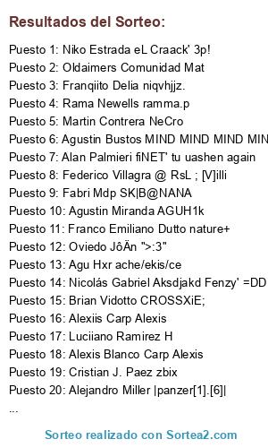 Feer Centeno ZerO ^^ SkatE:_, LuKaas PoLanco Luuqhz', Joako Combina joaquiN', Oviedo JôÄn ">:3", Danniel Valor L u x o r, Jesus Baez benQ, Ignacio Gonzalez D3F4UL7_xD, Julian Figueroa Z1ON^, MeeLina BeLén *Neko Girl~, Alan Palmieri fiNET' tu uashen again , Agus Sampayo t3rr3c4bio, Agustin Jesus Martinez KRAToS, Tata Lpc TATA, Damian Bz ;g0tzze^, Ivan Blanco El moko pa', Rodoo Solano ReVenGe, Ezequiel Fernandez EzeWow x_o :B, Mee Lúù González MeeLuu, Nachito Cister LEONIDAS, Angel Fofre SuPrEmE, Franco Salazar kUff s2, Nicolas Manzanedo LyoN;, Aguustin Lezcanoo Bugutu^, Cano Juan Nexo TU PAPA JOSE JAJAJA, Alë Jimmenez J4ndru', Niko Estrada eL Craack' 3p!, Mati Villaverde ma7i 70j374, Agustin ssankk, Abel Pissano AbL, Melany Priscila Genova Shynna XD!!!, Alejandro Miller |panzer[1].[6]|, Nicolas Gimenez Mind-bending, Braian Baez Braian, Jose Maria Rusch ChicoMilk, Agus Juarez TONTON QUIERE CHICLON, Tomy Luna cArn