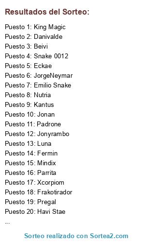 Lista de participantes: Beivi, Pregal, Xcorpiom, Jonyrambo, Parrita, Mindix, Frakotirador, Luna, Danivalde, Snake 0012, Anicolao, Havi Stae, JorgeNeymar, Padrone, Jonan, Emilio Snake, Sentenza, Eckae, Nutria, Fein, King Magic, Kantus, Fermin, Qememetes.