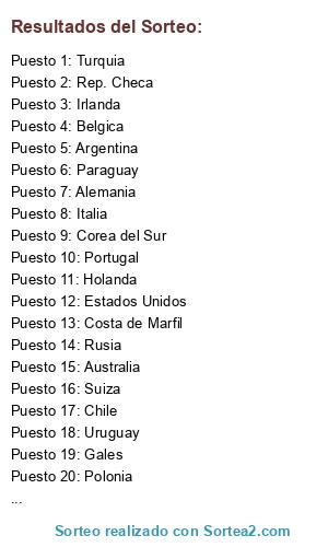Lista de participantes: Francia, Portugal, Sudafrica, Grecia, Ecuador, Turquia, Polonia, Italia, Gales, Chile, España, Brasil, Camerun, Costa de Marfil, Alemania, Australia, Irlanda, Colombia, Corea del Sur, Suecia, Suiza, Belgica, Estados Unidos, Rep. Checa, Uruguay, Holanda, Argentina, Dinamarca, Mexico, Inglaterra, Rusia, Paraguay.
