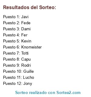 Lista de participantes: Javi, Dami, Totti, Fede, Rodri, Lucho, Guille, Kevin, Knomeister, Fer, Jony, Capu.