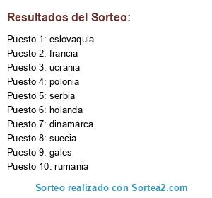 Lista de participantes: eslovaquia, rumania, polonia, gales, ucrania, dinamarca, francia, suecia, serbia, holanda.