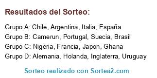 Lista de participantes: Inglaterra, Uruguay, Holanda, España, Portugal, Suecia, Japon, Italia, Francia, Camerun, Brasil, Alemania, Argentina, Ghana, Chile, Nigeria.