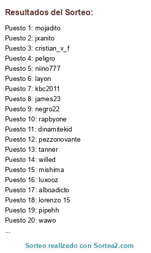 Lista de participantes: Llerar, rapbyone, cesarlp, camilopx, tiwinky, dinamitekid, wawo, niino777, lorenzo 15, xepah2, jxanito, layon, frankeeazul, alboadicto, pj, nicolas.felipe, seAB_, james23, jeremy, kbc2011, luxooz, negro22, geek, zalk, pipehh, nain, randy, cristian_v_f, tanner, mojadito, pezzonovante, darkoz, ghaleon, mishima, peligro, popeye, willed, criscr8.