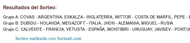 Lista de participantes: COVAS - ARGENTINA, VETUSTA - ESPAÑA, PEPE - BRASIL, ESKALZA - INGLATERRA, CALVENTE - FRANCIA, DUBIDU - HOLANDA, JHON - ALEMANIA, MEGAZOFT - ITALIA, JAVISEV - PORTUGAL, WITTOR - COSTA DE MARFIL, MIGUEL - RUSIA, MONTIBIRI - URUGUAY.