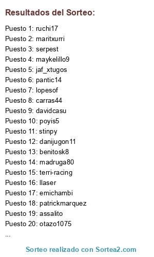 Lista de participantes: poyis5, benitosk8, stinpy, danijugon11, murcia5, lopesof, maritxurri, llaser, pelavivo, emichambi, beto_einsha, pegaso111, patrickmarquez, davidcasu, beivi98, serpest, ruchi17, otazo1075, adrrian36, assalito, maykelillo9, mazinger2008, nakarovich, carras44, juliko55, terri-racing, madruga80, pantic14, jaf_xtugos.
