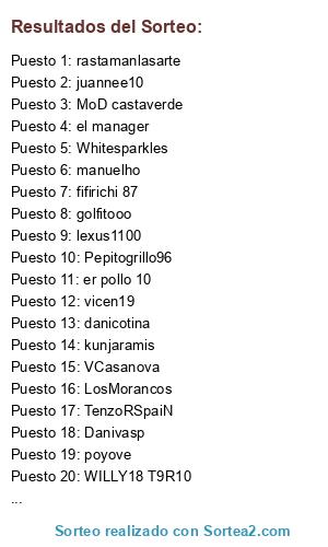 Lista de participantes: poyove, juannee10, Danivasp, maton95, fifirichi 87, Murill069, Pepitogrillo96, VCasanova, Jayoldi, er pollo 10, TurfyTomas, pakiu, lexus1100, golfitooo, kunjaramis, Kiedis7, puerto santiago, Zendaran, OverPick, fonseka1, manuelho, LosMorancos, fuzzyemaxxx, izenbako123, el manager, elp0se, Grey jutge, zairman, MoD castaverde, danicotina, WILLY18 T9R10, Whitesparkles, naiveElculebra, valkur28, rastamanlasarte, furiousjru, TenzoRSpaiN, vicen19.