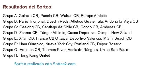 Lista de participantes: Tánger Athletic, Adelaide Rángers, Europe Athletic, Amberes CB, France CB Ottawa, Xi’an CB, Hong Kong United, Wuhan CB, Houston CB, Nueva York City, Miami Beach CB, Portland CB, Pucela CB, Thames River, Zennor CB, Olimpic New Zeland, Duedin Reds, Congo CB, Geelong CB, Galaxia CB, Andorra la Vieja CB, Lima Olímpico, Cusco Deportivo, Uniao Sao Paulo, Dépor Rosario, París Trionphal, Deportivo Valencia, Atlético Guatemala, Santiago de Chile CB.