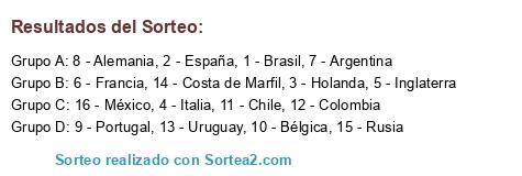 Lista de participantes: 1 - Brasil, 2 - España, 3 - Holanda, 4 - Italia, 5 - Inglaterra, 6 - Francia, 7 - Argentina, 8 - Alemania, 9 - Portugal, 10 - Bélgica, 11 - Chile, 12 - Colombia, 13 - Uruguay, 14 - Costa de Marfil, 15 - Rusia, 16 - México.