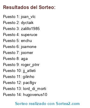 Lista de participantes: joamone, hugovenus10, jj_atleti, dyctaik, zalillo1985, enchu, joan_vlc, superuce, gilinho, pac8gv, aga, lord_di_morti, joomer, roger_ptnr.