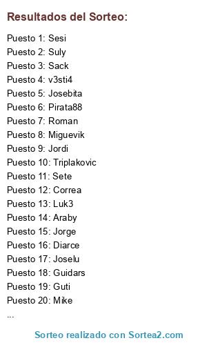 Lista de participantes: Jorge, Josebita, Luk3, Pirata88, Jordi, Guti, Miguevik, Suly, Correa, Joselu, Sete, Araby, Guidars, Roman, Sesi, Mike, Victor, Triplakovic, v3sti4, Sack, Diarce.
