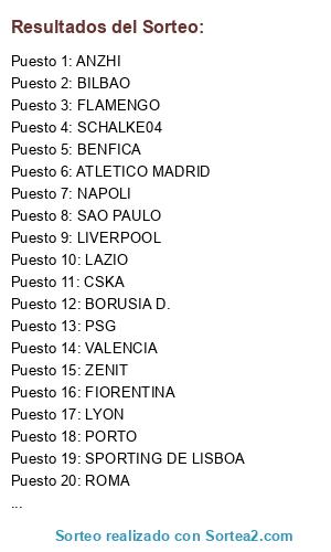 Lista de participantes: LIVERPOOL, BENFICA, LYON, ANZHI, FLAMENGO, CSKA, PSG, SPORTING DE LISBOA, NAPOLI, ZENIT, MARSELLLA, LAZIO, BILBAO, SAO PAULO, ATLETICO MADRID, PORTO, SCHALKE04, BORUSIA D., FIORENTINA, ROMA, SANTOS, VALENCIA.