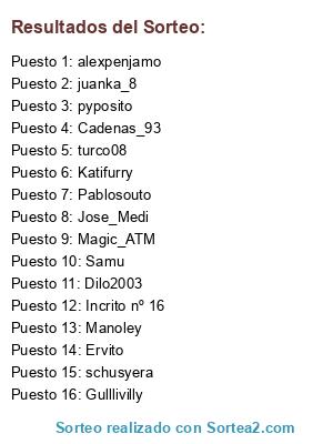 Lista de participantes: Ervito, schusyera, Katifurry, Manoley, Pablosouto, Dilo2003, Cadenas_93, Gulllivilly, pyposito, Magic_ATM, alexpenjamo, Jose_Medi, Samu, turco08, juanka_8, Incrito nº 16.