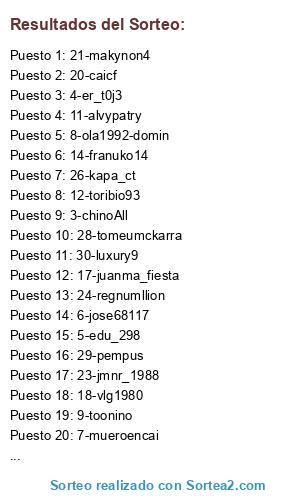 Lista de participantes: 1-kikee_25, 2-chuli-chuli, 3-chinoAll, 4-er_t0j3, 5-edu_298, 6-jose68117, 7-mueroencai, 8-ola1992-domin, 9-toonino, 10-ivanmu7, 11-alvypatry, 12-toribio93, 13-titokameni, 14-franuko14, 15-ganso15, 16-el_lentejas, 17-juanma_fiesta, 18-vlg1980, 19-lexonaco, 20-caicf, 21-makynon4, 22-daninct, 23-jmnr_1988, 24-regnumllion, 25-dani-efese84, 26-kapa_ct, 27-Paulstar1010, 28-tomeumckarra, 29-pempus, 30-luxury9.