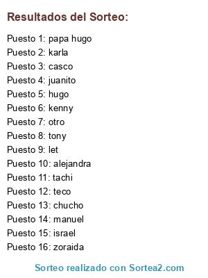 Lista de participantes: israel, let, zoraida, manuel, tony, casco, chucho, hugo, papa hugo, tachi, karla, alejandra, teco, juanito, kenny, otro.
