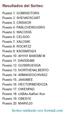 Lista de participantes: SHEVAOSCAR7, HECTORMENDOZA, DAVID5489, PABLOVERGUERO, JAAIIMEE, MARVL03, XALOSKI, NORTHENALBERTO, CRISAOR, AH1N1 MAKSIM M, ROCKF22, oXBAo AaRon Kun, WACO555, KAOSMEN24, OWENPAD, GUSSRUESGA, ARMANDOCHIVA02, CELSOO, GOMINEITORS, OBED10.