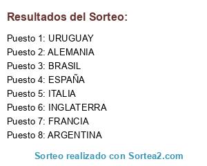 Lista de participantes: ARGENTINA, BRASIL, URUGUAY, ALEMANIA, ITALIA, INGLATERRA, ESPAÑA, FRANCIA.