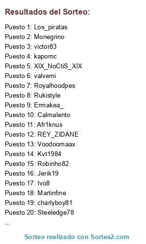 Lista de participantes: Guarro82, Ermakea_, chusele4, kapomc, canxo, Martinfine, Afr1knus, Calmalento, GusNeib_, Siderot, MXMaX1314, valvemi, rubenperez2, el_manillas, victor83, Absolon, Monegrino, Royalhoodpes, makopes, charlyboy81, Jerik19, jaujau_cerril, BNRER, mandacarayo, Robinho82, REY_ZIDANE, ury23, Steeledge78, XlX_NoCtiS_XlX, TOCOPILLATOR17, messiano, Kvt1984, Ivo8, Aragorn, Voodoomaax, Thcsomo, Rukistyle, Bygin, Adrian, Los_piratas.