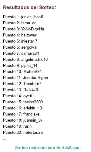 Lista de participantes: ab-17, MateoV91, Sarpo, Isma_cr, haitower, YoNoDigoNa, nefertari26, franciske, pipita_14, rurin, camara81, G37393739, belshe1, sergolval, Joseba-Rigon, Tipoduro7, TERREMOTO_10, LocoFredd, juansin_vk, T3ck0_80, patavic83, tavins2000, hermanosph, oyeti, el_manillas, junior_jhon6, RaN4z0-, arlekin_13, zebra26zepa1mono, iniesta17, angelmadrid10, ciga2010.