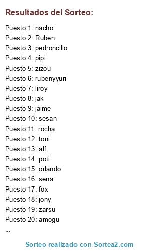 Lista de participantes: oskis, adri, Ruben, contreras, liroy, orlando, sena, brais, alf, toni, fox, nacho, rocha, poti, rubenyyuri, jaime, pedroncillo, javinano, jak, zizou, albertillo, amogu, calvente, munox, jony, pipi, xoxe, sebas, zarsu, sesan, niin, corpa.
