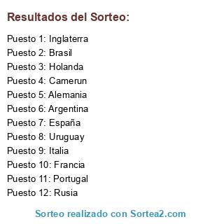 Lista de participantes: Uruguay, Portugal, Italia, Rusia, Camerun, España, Francia, Holanda, Brasil, Inglaterra, Argentina, Alemania.