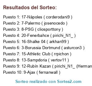 Lista de participantes: 1-Besiktas ( juan245 ), 2-Galatasaray ( IBIZACUPRAYONY ), 3-Borussia Dortmund ( asturcon3 ), 5-Lazio ( Felthemonster ), 6-Sunderland ( guille_gr9 ), 7-Palermo ( josenocedo ), 8-PSG ( cliosporttony ), 9-Ajax ( fernanwall ), 10-CSKA de Moscú ( bend3rmd ), 11-PSV ( n_gonrev ), 12-Rubín Kazan ( pirichi_N1_ (Hermano) ), 13-Sampdoria ( vertov11 ), 14-Hoffenheim ( elfus21 ), 15-Athletic Club ( rrpichon ), 16-Shalke 04 ( arkhan99 ), 17-Nápoles ( corderodani9 ), 18-Sporting de Gijón ( kuox ), 19-Fiorentina ( ander19 ), 20-Fenerbahce ( pirichi_N1_ ).