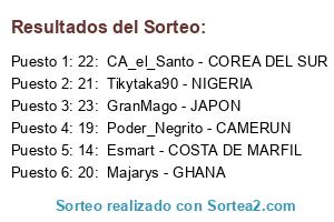 Lista de participantes: 19: Poder_Negrito - CAMERUN, 20: Majarys - GHANA, 21: Tikytaka90 - NIGERIA, 22: CA_el_Santo - COREA DEL SUR, 23: GranMago - JAPON, 14: Esmart - COSTA DE MARFIL.