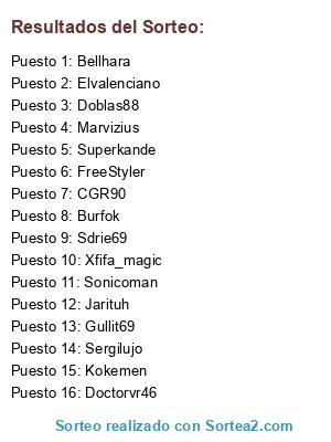 Lista de participantes: Marvizius, Sdrie69, Superkande, Doctorvr46, Bellhara, Sergilujo, Gullit69, Xfifa_magic, CGR90, Doblas88, Jarituh, FreeStyler, Sonicoman, Elvalenciano, Burfok, Kokemen.
