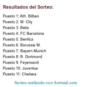 Lista de participantes: Benfica, Betis, Borussia M., Feyenoord, Juventus, M. City, Ath. Bilbao, B. Dortmund, Bayern Munich, Chelsea, FC Barcelona.