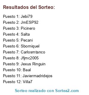 Lista de participantes: Pecani, Salta, JmESP92, Jexus Ringuin, Jfjmc2005, Sborniquel, Villa7, Carlosmtanco, Javiermadridejos, Jebi79, Picinero, Baal.