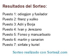 Lista de participantes: Adri y Borja, Fonso y manuarbusto, martin y canarion, fitenz y xuliko, sinfate y kuriel, odiogijon y fusilador, Ivan y Jerezano.